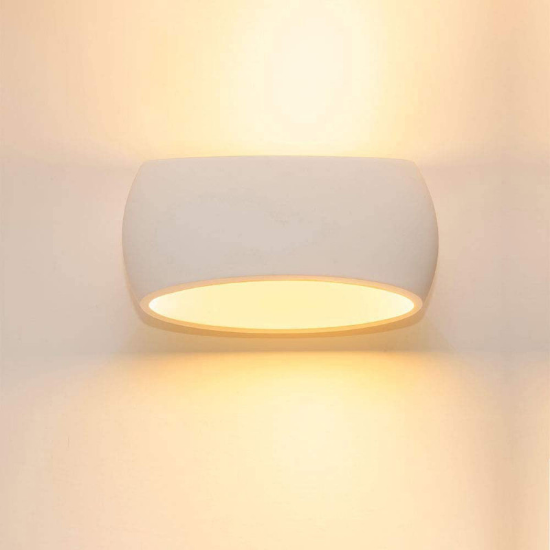 Applique da parete ovale a doppia emissione "up e down". Struttura completamente in gesso verniciabile. La base grezza consente di scegliere se lasciarli bianchi o verniciarli del colore desiderato. Facile da fissare con le viti in dotazione.