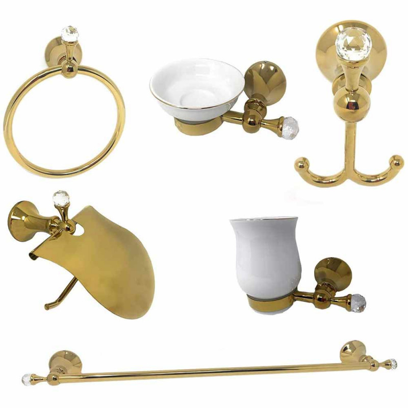 Set da bagno in acciaio oro e ceramica decorato con punti luce in cristalli acrilici per dare un tocco di classe al vostro arredamento. Completo di 6 pezzi porta rotolo, porta asciugamano ad anello, porta asciugamano lungo (60 cm), bicchiere portaspazzolino, porta sapone e gancio per accappatoio. La confezione comprende viti e i tasselli per il fissaggio.