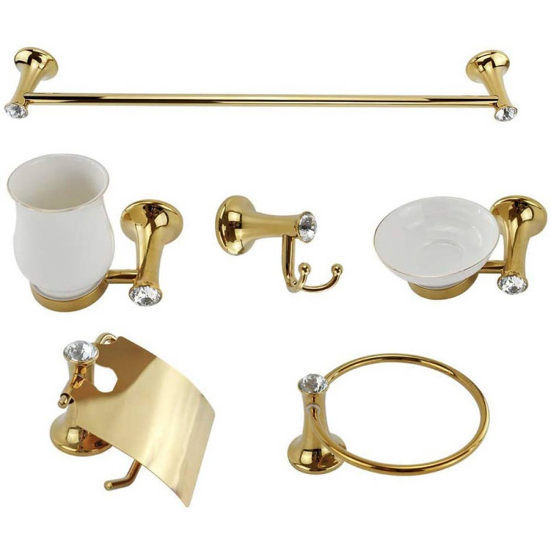 Set da bagno in acciaio oro e ceramica decorato con punti luce in cristalli acrilici per dare un tocco di classe al vostro arredamento. Completo di 6 pezzi porta rotolo, porta asciugamano ad anello, porta asciugamano lungo (60 cm), bicchiere portaspazzolino, porta sapone e gancio per accappatoio. La confezione comprende viti e i tasselli per il fissaggio.