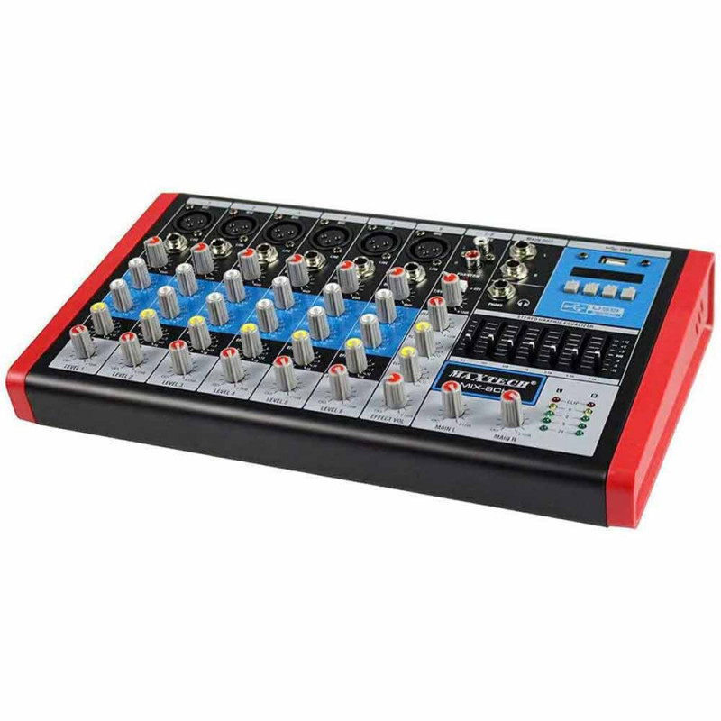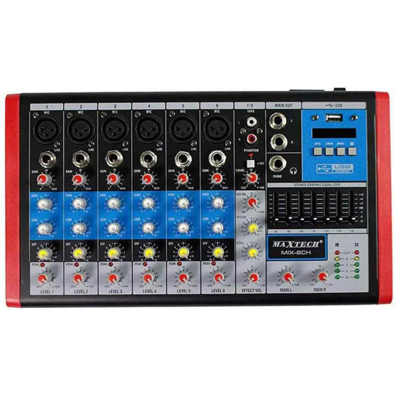 Mixer professionale con ben 8 canali per poter mixare 8 fonti audio differenti in un unico suono e con un unico mixer! Divertitevi a creare basi musicali miscelando canzoni, suoni e molto altro, fate pratica per diventare i migliori dj della zona. Dotato di ben 6 ingressi per microfoni a condensatore XLR a bassa impedenza con funzione phantom +48V, ingresso USB per riprodurre brani direttamente dalla pennetta e grazie al suo display sarà più facile gestire i file, 6 ingressi HI-LINE per collegare tastiere o giradischi, Ingressi TAPE rca. Dispone di due manopole GAIN per regolare il volume del brano e di un' equalizzatore stereo per bilanciare l'audio, inoltre potrete creare giochi di suono con l'effetto ECO.