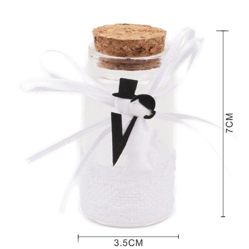 Bomboniera portaconfetti per matrimonio a forma di barattolo in vetro con tappo in sughero per inserire confetti o caramelle. Dispone di una banda merlettata bianca, una decorazione che rappresenta una coppia di sposi e di un nastrino bianco. Ideale anche come segnaposto per addobbare i tavoli il giorno del vostro matrimonio.