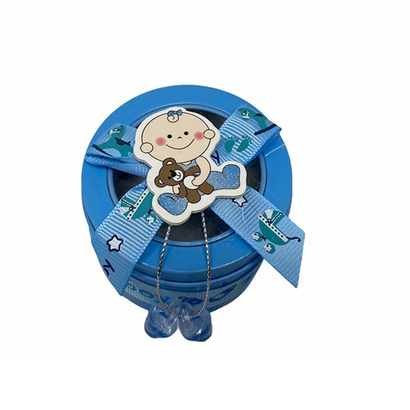 Scatoline porta confetti rotonda in latta, dove poter inserire confetti o caramelle. Decorata con neonato, nastrino e coppia di ciuccio Perfette per celebrare una nascita o per un battesimo.