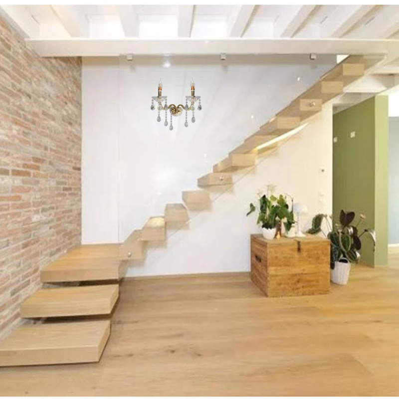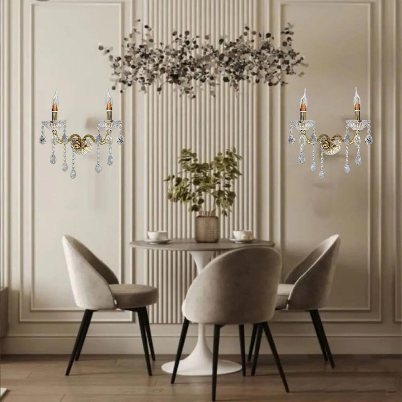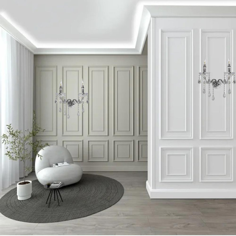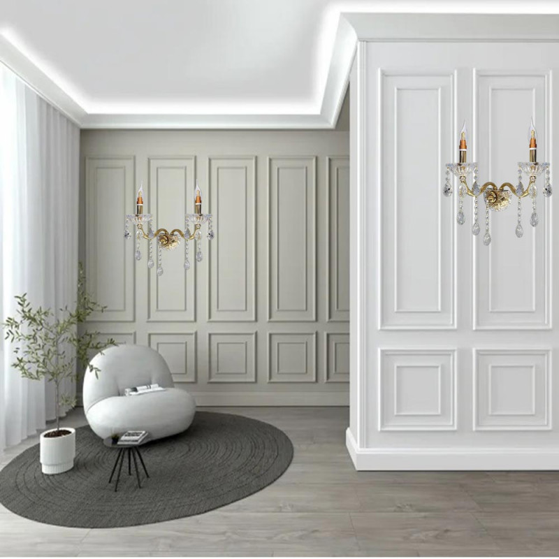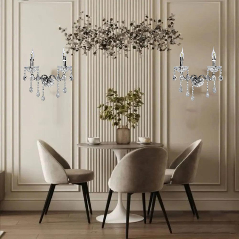 Applique da parete stile retrò impreziosito con gocce pendenti di cristallo in acrilico dotato di 2 candelabri con attacco E14 per installare le lampadine.