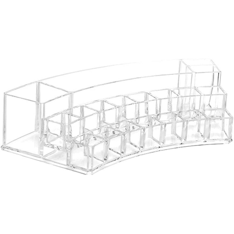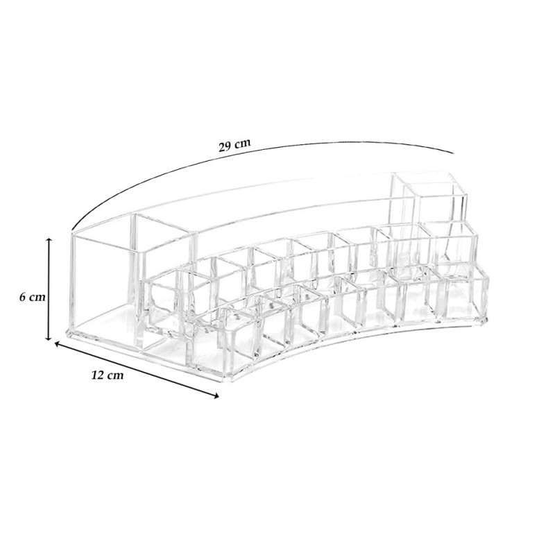 Pratico ed utile organizer porta trucchi ideale per tenere in ordine tutto il make up. Dotato di 19 scomparti di varie grandezze per poter contenere rossetti, pennelli, smalti e molto altro. Grazie al suo design è possibile utilizzarlo anche come complemento d’arredo per il bagno o per la camera da letto utilizzandolo come espositore. Realizzato in plastica resistente e trasparente per aiutarvi a trovare in modo semplice tutti i trucchi che cercate!