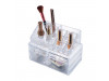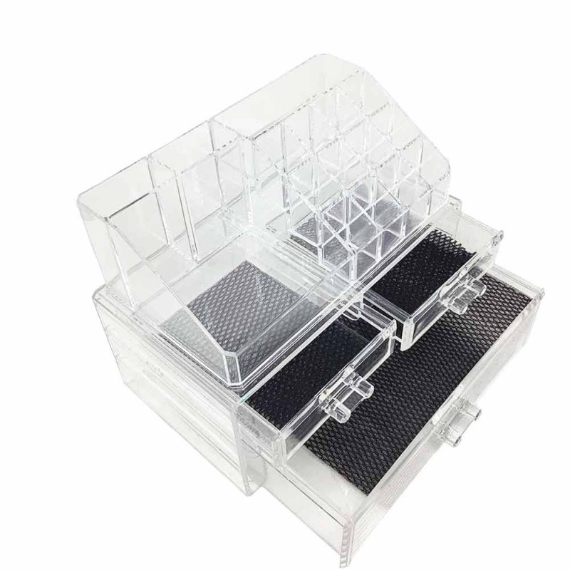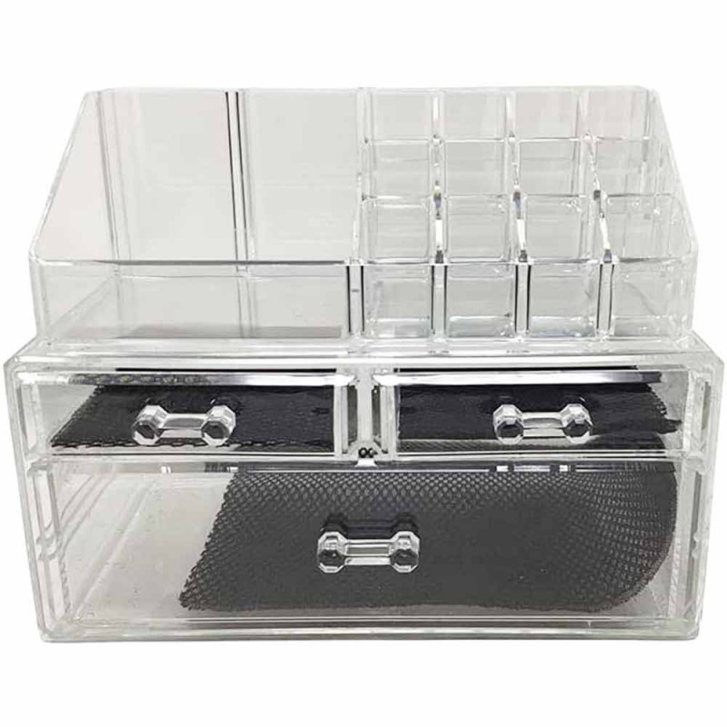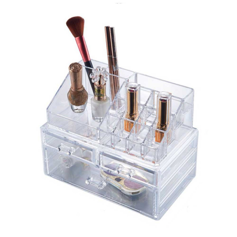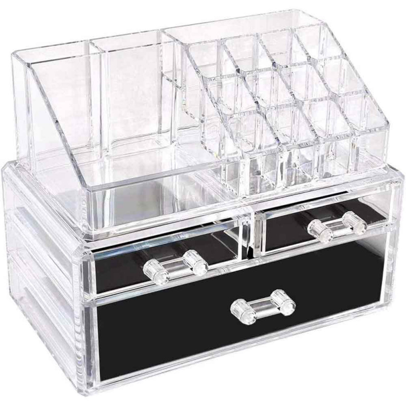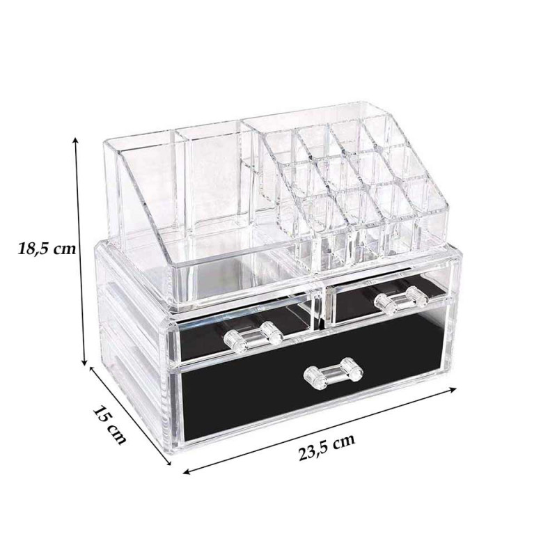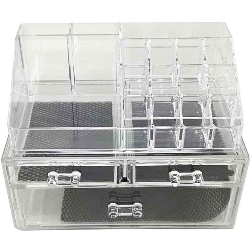 Pratico ed utile organizer porta trucchi ideale per tenere in ordine tutto il make up, dotato di 16 scomparti dove poter inserire rossetti, pennelli, mascara e matite e di cassetti dove inserire creme, fondotinta o da utilizzare come portagioielli. Grazie al suo design è possibile utilizzarlo anche come complemento d’arredo per il bagno o per la camera da letto utilizzandolo come espositore. La parte superiore è possibile rimuoverla per poterla sistemare in un’altra stanza. Realizzato in plastica resistente e trasparente per aiutarvi a trovare in modo semplice tutti i trucchi che cercate!