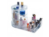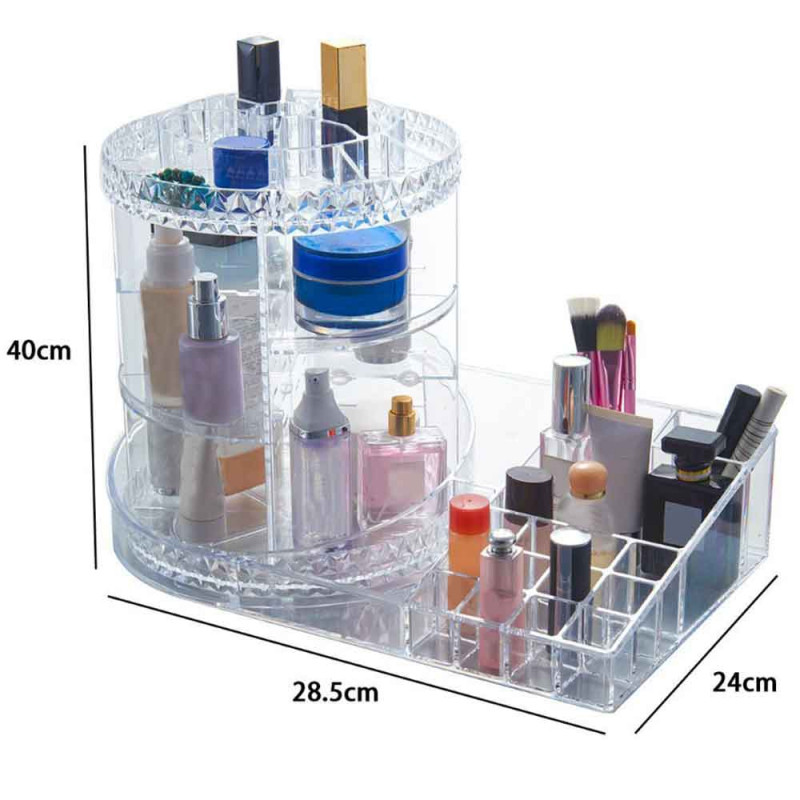 Pratico ed utile organizer porta trucchi girevole ideale per tenere in ordine tutto il make up, composto da una parte a torre girevole con vari ripiani e scomparti, e una parte laterale anch’essa suddivisa in varie postazioni dove poter inserire rossetti, pennelli, mascara e matite. Grazie al suo design è possibile utilizzarlo anche come complemento d’arredo per il bagno o per la camera da letto utilizzandolo come espositore.