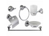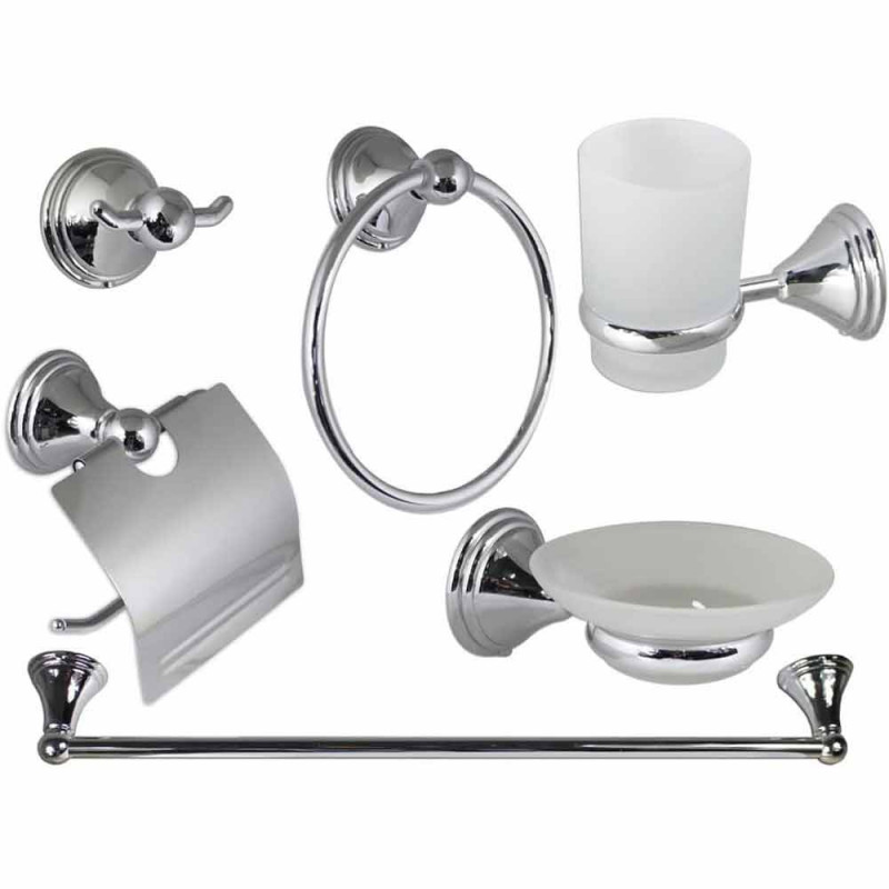Bellissimo set da bagno dal design moderno , in acciaio cromato e vetro satinato. Completo di 6 pezzi porta rotolo, porta asciugamano ad anello, porta asciugamano lungo (58cm) ,bicchiere porta spazzolini, porta sapone e gancio per accappatoio . La confezione comprende viti e i tasselli per il fissaggio .