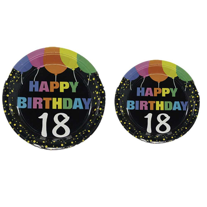 Set di 28 piatti per feste di compleanno Ideali per decorare la tua tavola per il tuo 18 compleanno Il set comprende: 12 piatti grandi da Ø 22 cm 9”, 16 piatti piccoli da Ø 17 cm 7” Di colore nero con pallini gialli decorato con palloncini colorati Con scritta HAPPY BRIRHDAY e numero 18