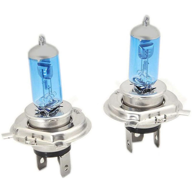 Coppia di lampadine alogene per auto con attacco H4. Producono un fascio di luce luminosissimo con una gradazione intorno ai 5000° kelvin , simile a quella delle lampade xenon.