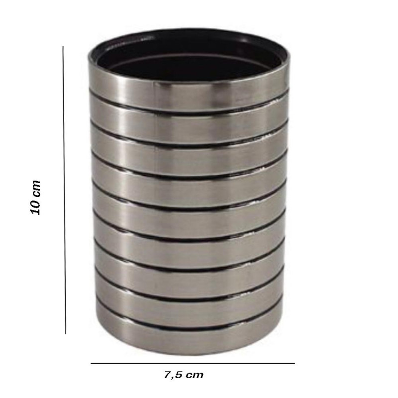 Rinnova e completa il tuo ambiente bagno curando i dettagli con un accessorio che donano eleganza e charme al tuo bagno moderno, senza rinunciare alla praticità. Il bicchiere porta spazzolini è di colore argento con righe nere.