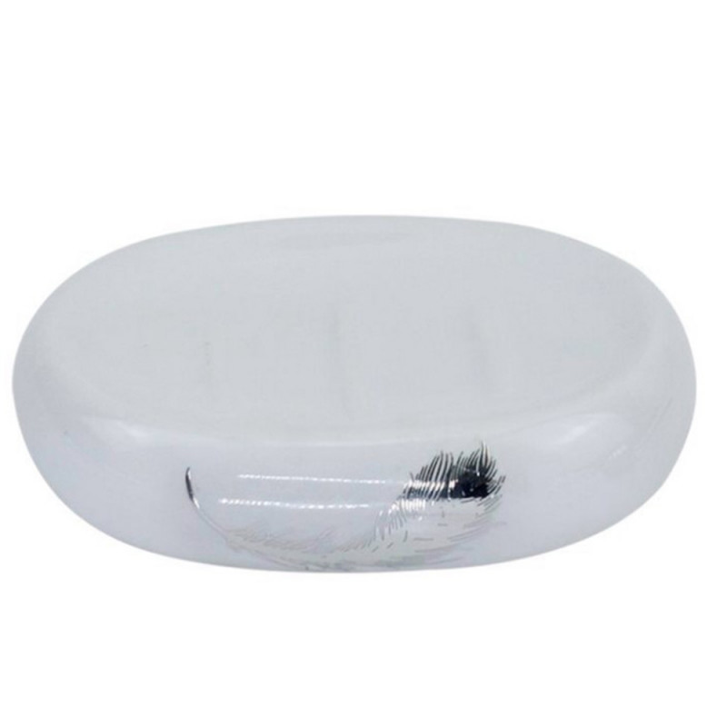 Piattino porta saponetta d’appoggio ideale per arredare un bagno curato nei minimi particolari. Interamente realizzato in ceramica decorato con una piuma di colore argento.