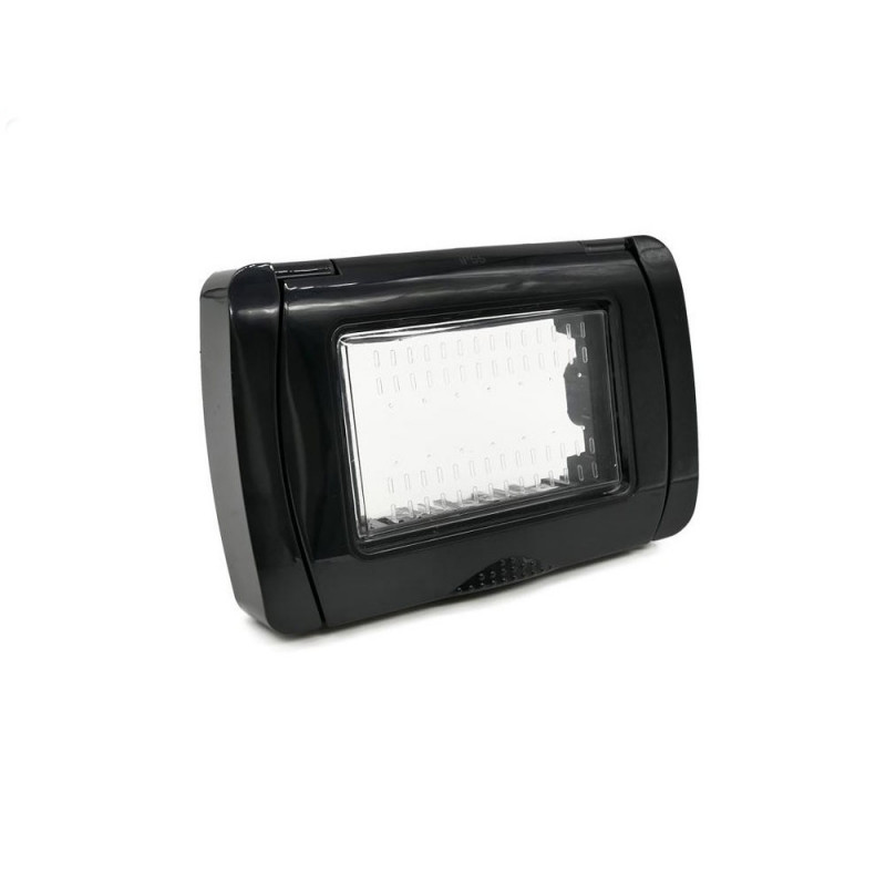 La placca stagna 3 posti è particolarmente versatile e comoda per poterci alloggiare tanto moduli comando, quanto prese con la comodità del coperchio sollevabile. Va' alloggiata nell'apposito cestello 3 posti da acquistare a parte. Grado di Impermeabilità IP55